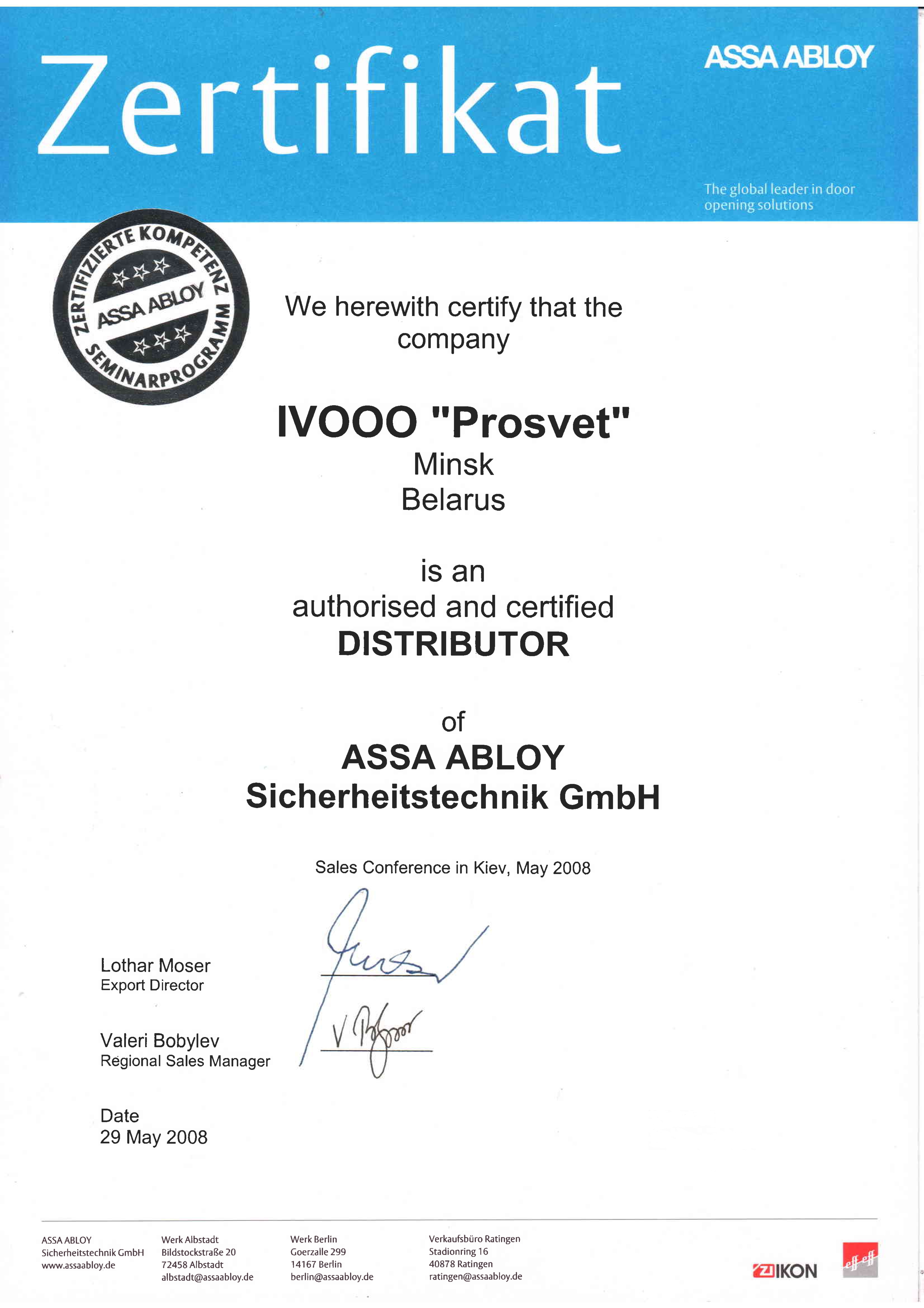 Сертификат PERCo Авторизованный дилер и сервисный центр