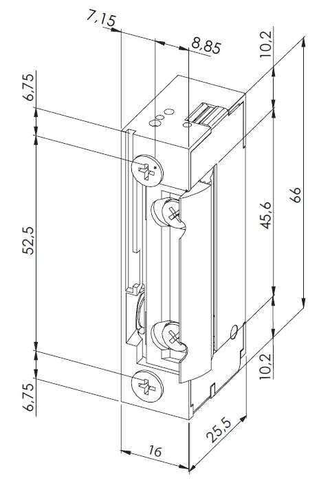 Универсальная узкопрофильная ЭМЗ обратного действия (при подаче напряжения закрыта) , корпус симметричный (ДхШхГ 66х16х25мм), рабочее напряжение 12 VDC (0,25 A), регулируемый радиусный язычок.