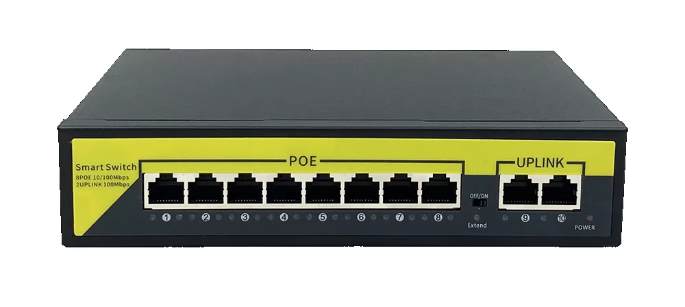 Неуправляемый PoE-коммутатор для систем цифрового видеонаблюдения. Работает в режиме коммутации Store-and-forward, размер буфера составляет 768 Кб.. Присутствует 8 портов 10/100M Ethernet с поддержкой PoE-питания и 2 uplink-порта 10/100M Ethernet. Суммарная пропускная способность составляет 2 Гбит/с.