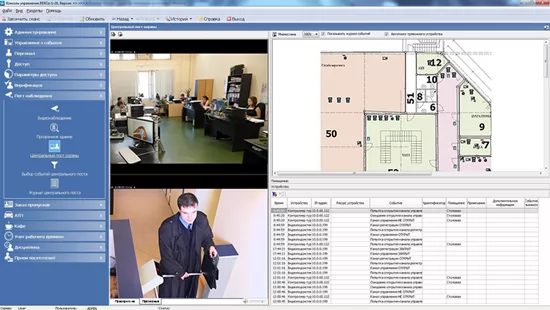 - при возникновении тревожной ситуации автоматическое отображение информации с камер видеонаблюдения и мнемосхемы помещения, где произошло тревожное событие, с указанием точного места возникновения тревоги