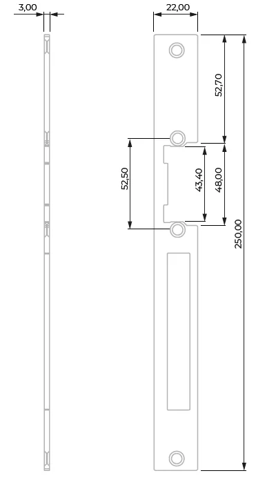 Планка плоская, большая, универсальная (250х22мм), нержавеющая сталь (расстояние между язычком и ригелем замка не менее 12 мм), 2 крепежных отверстия.