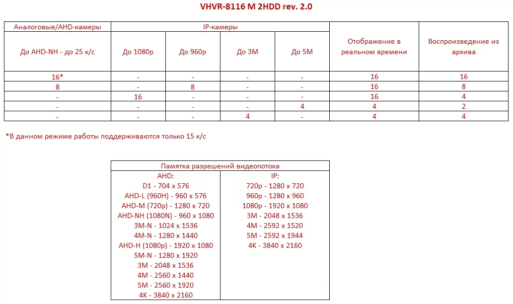Режим работы регистратора: IP, AHD, HD-CVI, HD-TVI, CVBS; Количество каналов: 16 BNC; Разрешение записи: AHD: 1080N; IP: 5M, 1080p; Количество аудиовходов: 2 (RCA); Потр. мощность: 12 Вт (без HDD); Количество видеовходов: 16 (BNC); Видеовыходы: 1 VGA, 1 HDMI (до 1920 х 1080); Количество жестких дисков: 2 до 8 TБ (в комплект не входит); Блок питания: 12В (DC) 6А;