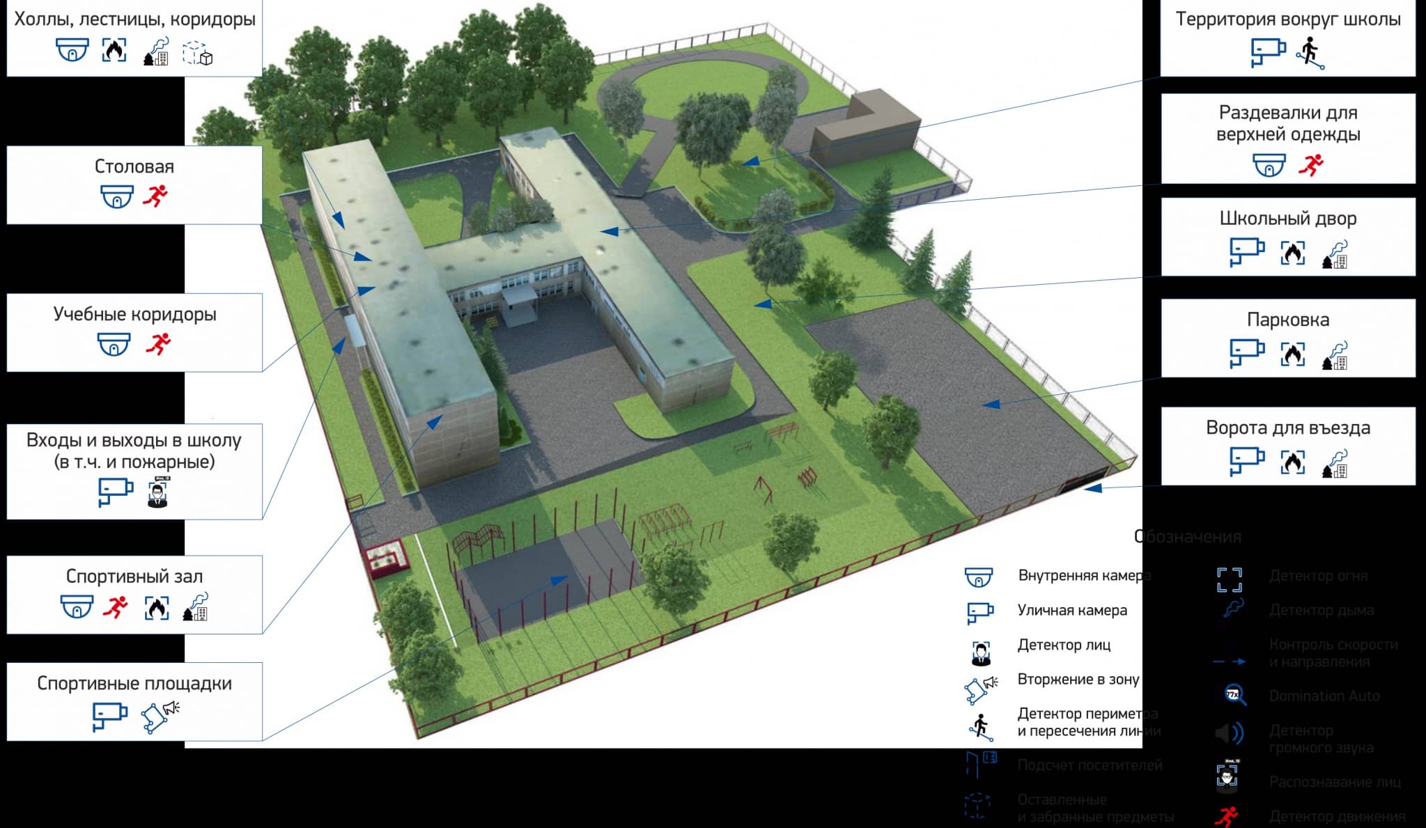 - в общественных местах. Видеонаблюдение помогает следить за порядком в местах с большим скоплением людей (спортивных мероприятиях, концертах, выставках);